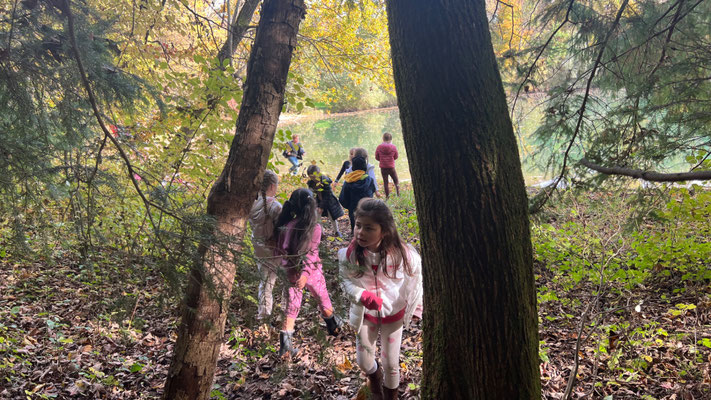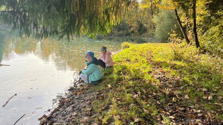 Die erste Pause legten wir auf einer großen Wiese ein, wo sich alle Kinder ihre Brotzeit schmecken ließen und anschließend spielen und toben durften. Danach wanderten wir gestärkt weiter durch die herbstlich gefärbte Au bis zum Auweiher, unserem Ziel. Dort blieb viel Zeit zum Entdecken, Bauen, Klettern und Spielen am Ufer und im Wald.
